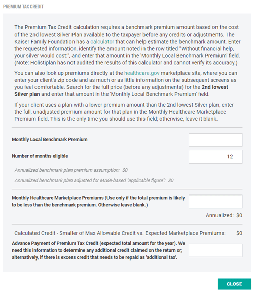 Click HERE to see a video showing a modeling of the Premium Tax Credit (PTC) in action. (Holistiplan has made changes to the behavior of the PTC Worksheet since the recording of this video, and Holistiplan no longer provides an estimated Monthly Local Benchmark Premium.)