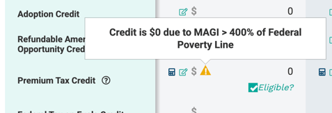 Starting in 2026, MAGI must be less than 400% of the Federal Poverty Line in order to be eligible for the Premium Tax Credit. If MAGI exceeds that threshold, no credit can be claimed. We will show the following alert if we detect that MAGI is too high in your scenario.