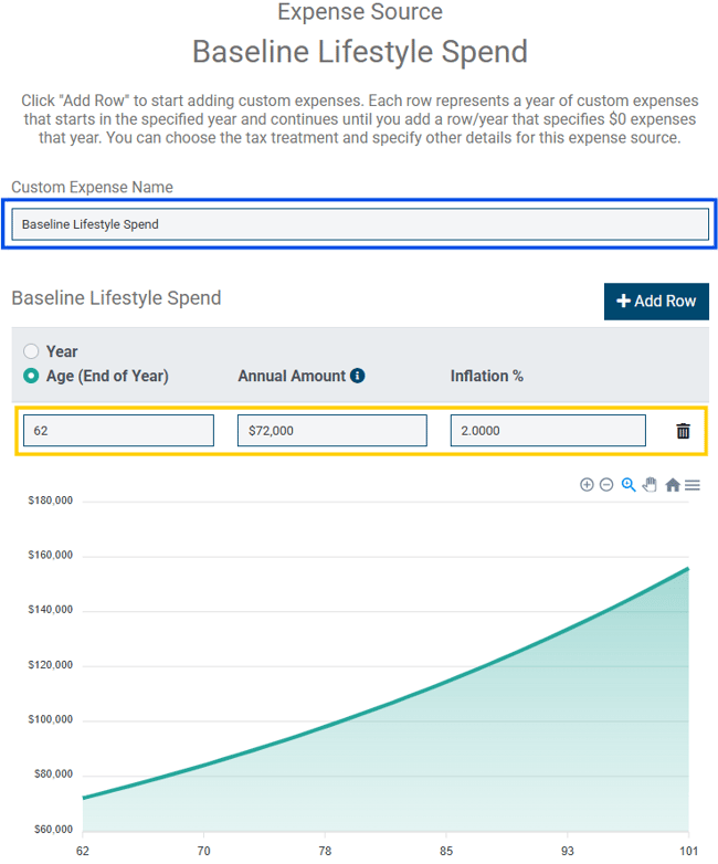 Use "custom expenses" to model additional expenses beyond baseline spending, spending that might inflate at different rates of inflation, or one-time expense items.