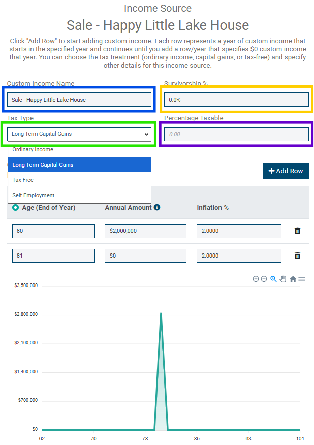 The example above assumes that Bob has a cost basis of zero for his lake house, and that he anticipates selling it for $2 million (today's dollars) when he turns 80. That $2 million is inflated at 2% per year from now - when Bob is 62 - until Bob's age 80, resulting in $2,856,492 coming into his portfolio in that year as a long-term capital gain. Because this is a one-time event, to ensure that the income does not persist every year through the end of Bob's projection, enter a $0 row at Bob's age 81.