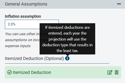 - Itemized Deduction (Optional): The standard deduction amount is used by default, but an itemized deduction assumption can be used instead. As seen below, Holistiplan will compare the standard deduction and any itemized deductions for any given tax year and use the one that results in the least amount of tax.