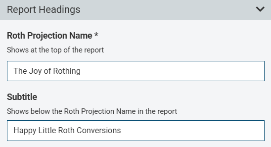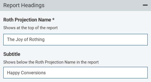 - Report Headings - Adjust the name of a Roth Projection by changing the title and subtitle here.