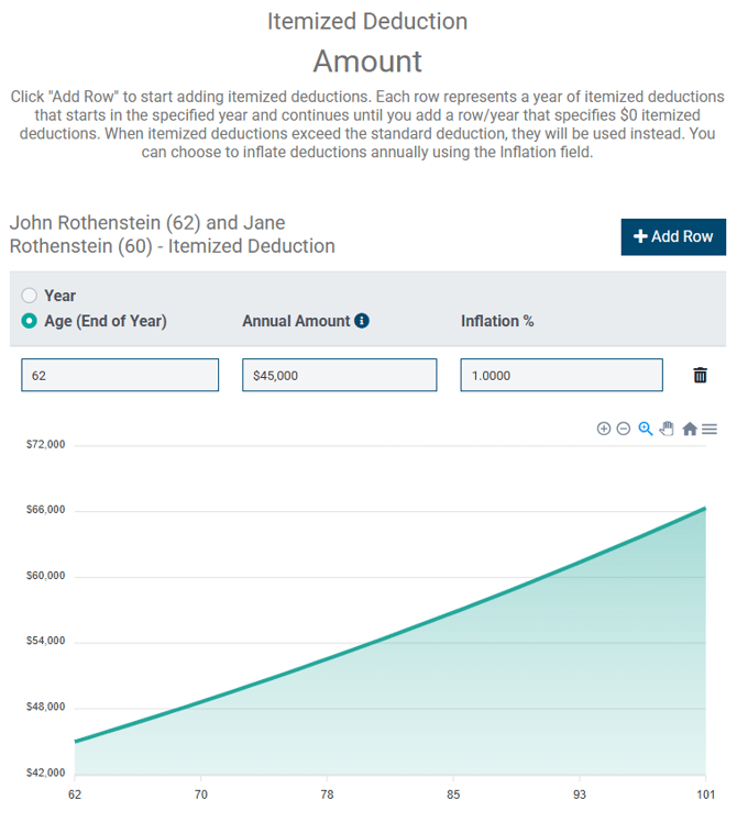 Select a start age or year, and then add rows as needed to start that itemized deduction amount, and an end age or year (if desired) to end that election.