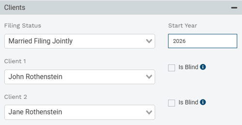- Clients - Adjust the information for the clients associated with the Roth Projection, including filing status, assigning Taxpayer/Client 1 and Taxpayer/Client 2, the year the analysis will begin, and whether either taxpayer is eligible for the additional standard deduction for blindness. Holistiplan will use the client names entered for Client 1 and Client 2 to refer to those clients throughout the results shown in the Roth Projection Tool.
