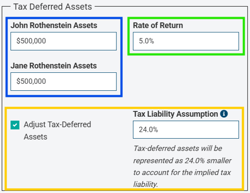 Finally, to account for the embedded tax liability of those tax-deferred assets, check the box in the Tax Liability Assumption / Adjustment for Tax-Deferred Accounts section outlined in yellow above, and enter a percentage assumption for that tax liability. Some argue this adjustment makes for a more "apples-to-apples comparison" between tax-deferred assets and Roth balances by accounting for the embedded tax liability in Traditional IRAs, 401(k)s, etc.