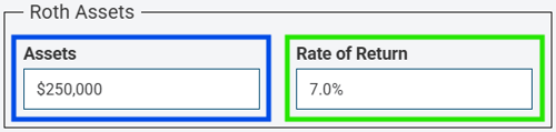 Enter the combined balance for any Roth accounts for Client 1 and Client 2 in the field outlined in blue above. Then, enter an annual return assumption for those combined Roth assets.