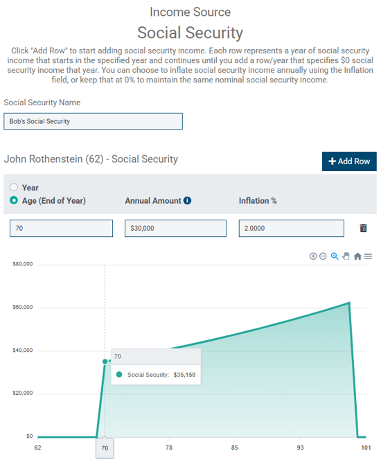 Enter any income items in today's dollars (present value), and use the inflation field to indicate how that income stream will grow in future years. For example, the Social Security entry below uses an amount of $30,000 in today's dollars to begin at this client's age 70. Since this client is currently 62 years old , inflating $30,000 at a rate of 2% for year for 8 years results in an income of $35,150 at his age 70. In this case, there is no row with a $0 amount, so this cash flow continues until the client reaches the entered life expectancy age of 100.