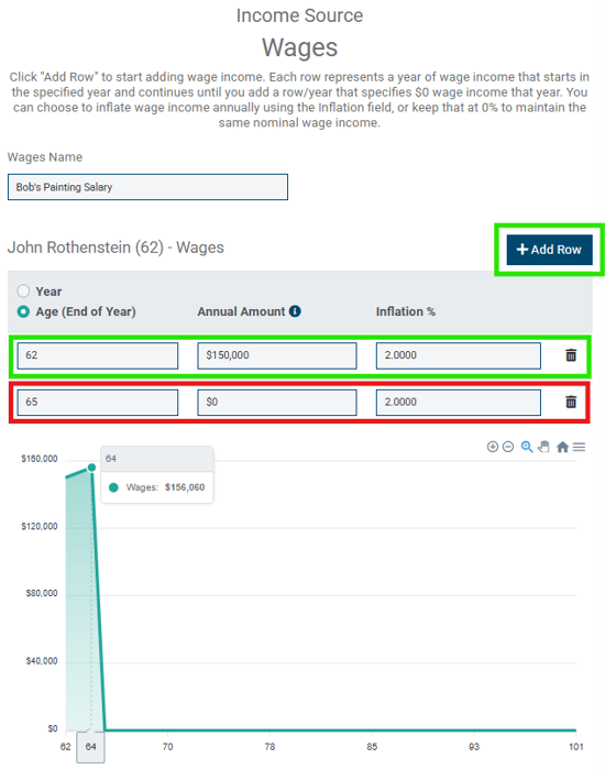 The example below illustrates $150,000 of Wage Income for Client 1 to reflect Bob's painting salary for two years, beginning at age 62, increasing by 2.0% per year, and ending at age 64, when he retires.