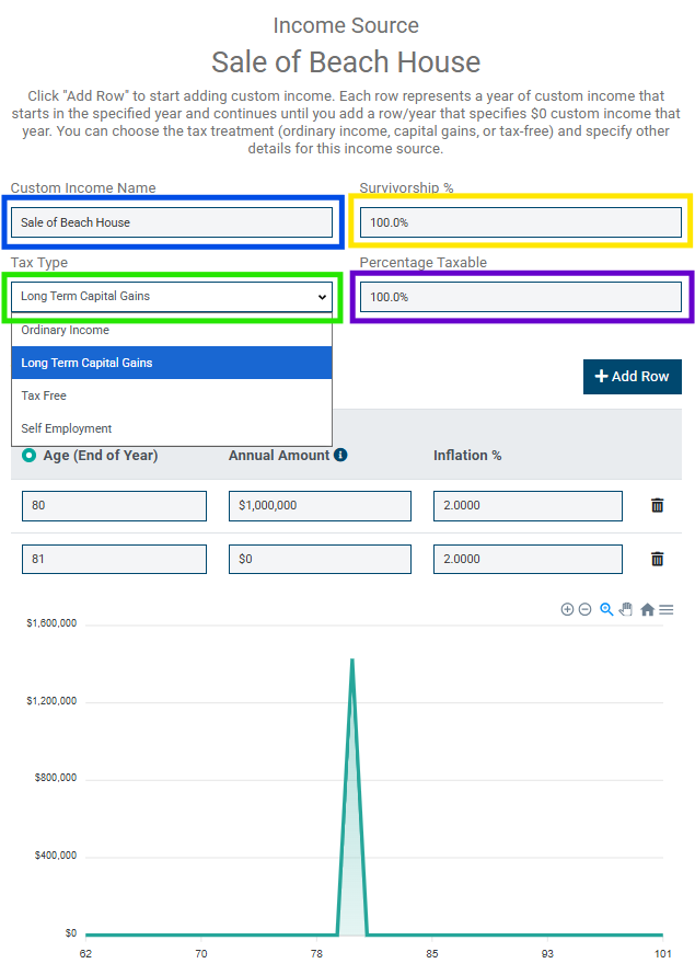 The example above assumes that John sells his and Jane's beach house for $2 million, but has a cost basis of $1 million for the beach house, and that long-term gain will be $1 million (today's dollars) when he turns 80. That $1 million gain is inflated at 2% per year from now, when John is 62, until John's age 80, resulting in $2,856,492 coming into his portfolio in that year as a long-term capital gain. Because this is a one-time event, to ensure that the income does not persist every year through the end of John's projection, enter a $0 row at John's age 81.