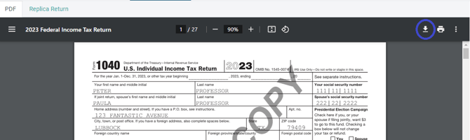 To download a tax return that has been uploaded by your client, click on the "View Return" link within the "Tax Returns" section of your client's household, which will open up the Document View page, showing the tax return PDF on the left, and Holistiplan's data entry panel on the right. You can then click the download button circled below to save a copy of the tax return PDF to your computer for your firm's files.