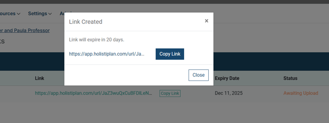 After clicking create, you will be provided with a secure link that can be copied and shared with the client. This link is active for 20 days.
