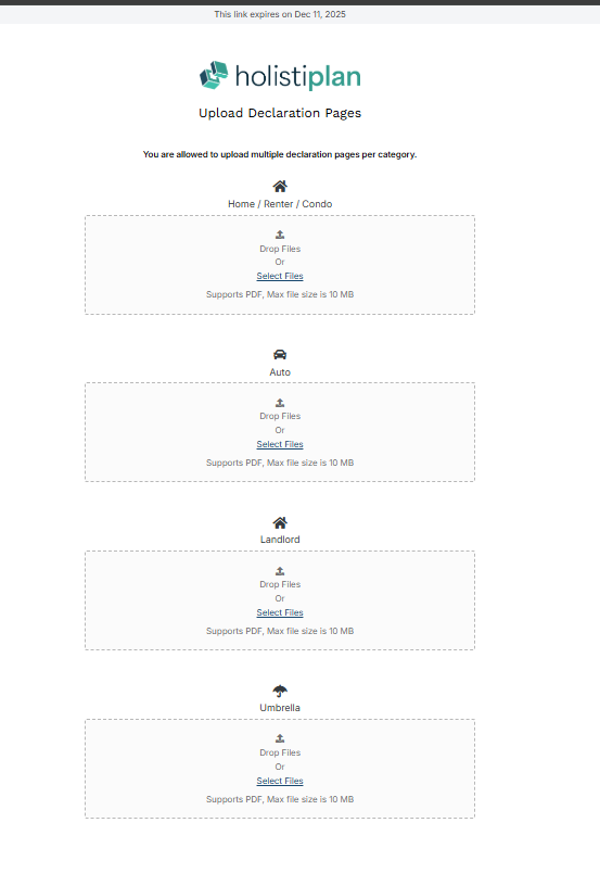 When clients open the link, they will see a simple, secure page prompting them to provide their P&C insurance documents. Clients can manually upload a PDF of their homeowners, renters, condo, auto, landlord, and umbrella declaration pages.