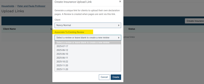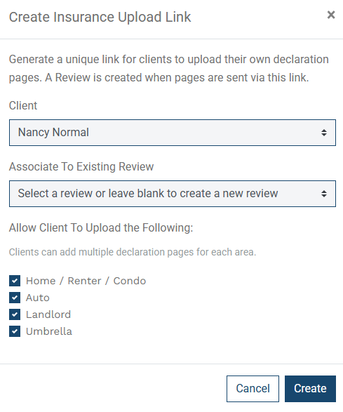 Note: If the household already has a P&C insurance review in progress, you can associate the upload link with that existing review so that any documents the client uploads are added directly to it rather than starting a new review. You can also select which document types you want the client to provide: