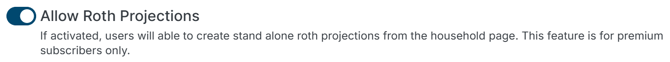 The Roth Projection Tool is available to Premium Plan subscribers. Firm Admins can enable this feature for their firms by navigating to Settings > Features & Tools > Tax and toggling on the "Allow Roth Projections" in the Permissions section.