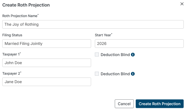 In the subsequent window, title the projection and indicate filing status, start year, assign client(s) as Tax Payer 1 and Tax Payer 2, and indicate if they are eligible for the additional standard deduction for blind taxpayers, as seen below. Then click the "Create Roth Projection" button.