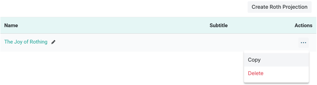 Users can re-title the projection by clicking the pencil icon next to the name of the projection. To copy or delete the scenario, click the three dots in the Actions column and select the relevant option.