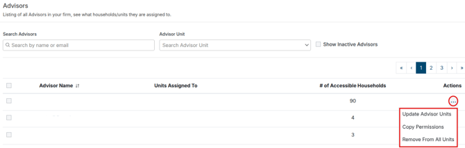 Advisors: Allows firm admins to view and manage advisor access across households and advisor units. From this page, admins can quickly see which households an advisor has access to and which advisor units they belong to.