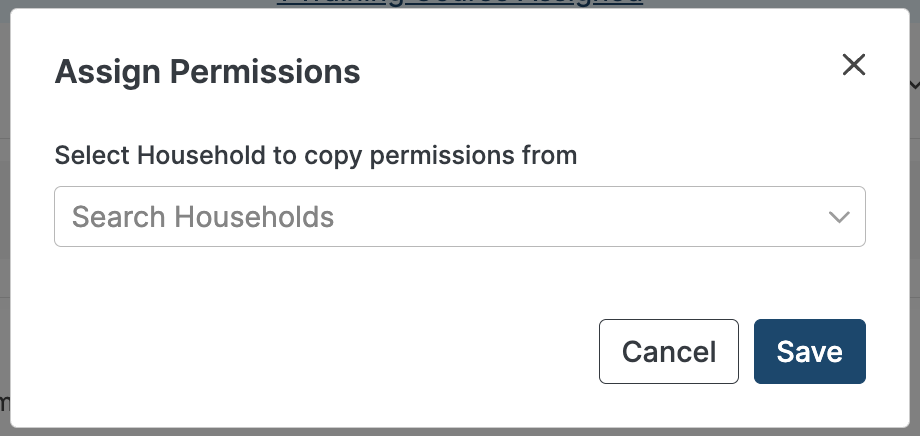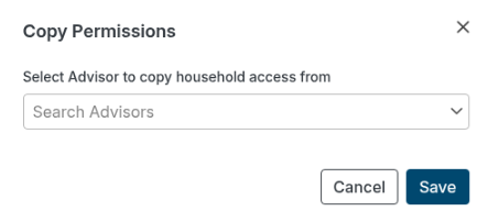 • Copy permissions from one household to another. If the Brown household has 2 units and 1 individual advisor with access, selecting the Browns in this dropdown would give those same 2 units and the individual advisor access to this household.