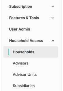Firm Admins can navigate to Settings > Household Access and select from the options on the left side of the screen.