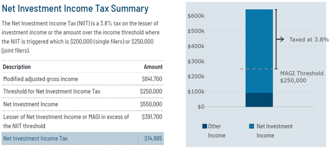 - The 3.8% tax is applied to the lesser of net investment income or to the extent a taxpayer's MAGI exceeds the applicable threshold above.