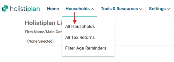 Deleting a household will delete all information associated with it, including uploaded returns, Scenarios, Tax Letters, and all reports. There are 2 methods that can be used to remove households. The first would be to head to your households listing page, found under the tab "Households" >> "All households."
