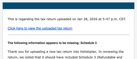When uploaded returns are flagged for missing data, you will receive an email from our manual review team about what is needed to confirm our calculations to generate an accurate Tax Report in bold at the top of the email.