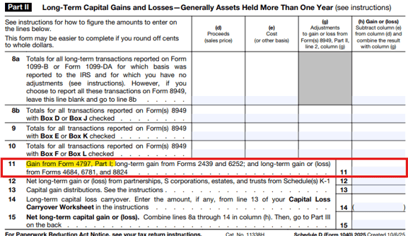 While Form 4797 reports the sale of business property, only the short-term gains subject to ordinary income flow through to the Other gains (or losses) line item related to Form 4797 on Schedule 1. Gains subject to long-term capital gains treatment are reported on Schedule D.