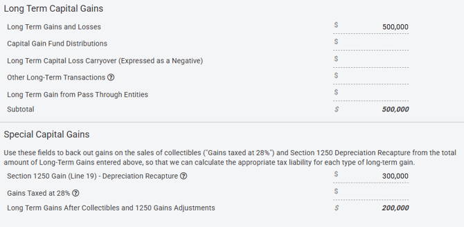 For example, let's say our clients sold a rental property for a net long-term gain of $500,000. While reporting that rental income on Schedule E over the years, they also deducted $300,000 in depreciation on that rental property. To accurately model that sale, we would want to enter the full $500,000 (not $200,000) in the Long Term Gains and Losses field in the Long-Term Gains modal, and $300,000 in the Section 1250 Gain (Line 19) - Depreciation Recapture field.
