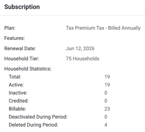 Review the firm's renewal date, household tier, and household statistics in the Subscription section.