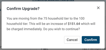 Select the household tier you want to move to in the Add More Households box and clicking View Pricing. The prorated cost of the upgrade will then be displayed before confirming the upgrade purchase.
