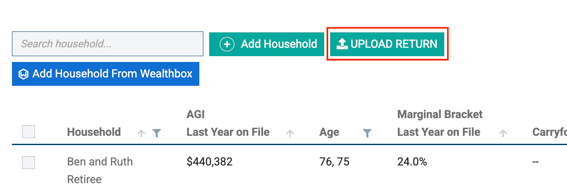 - On the Households page, click on the Upload Return button located to the right of the search bar located at the top left of the page