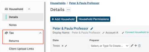 - Click on the name of the household you'd like to upload a return for and navigate to the 'Returns' in the 'Tax' section on the left-hand side.