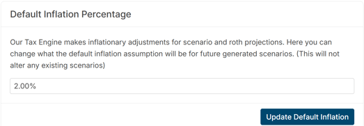 However, Firm Admins may adjust the firm-wide inflation assumption, and any users may choose to enter their own inflation assumptions for an individual scenario in Scenario Analysis. Users with Firm Admin privileges can navigate to Settings > Features & Tools > Tax, and scroll down to the Default Inflation Percentage section seen below.