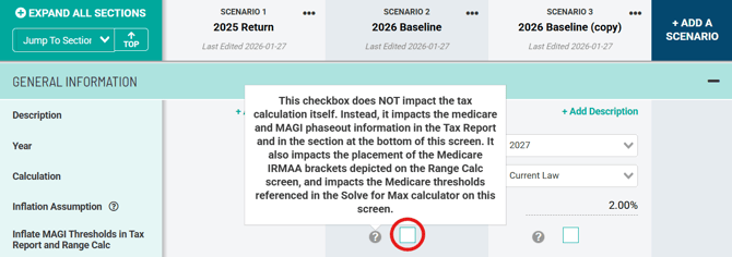 The checkbox under the Inflation Assumption field will similarly inflate the MAGI (Modified Adjusted Gross Income) thresholds in the Tax Report and Range Calc, shown below. Remember that there are several calculations of MAGI, so MAGI amounts can differ based on the specific application to which they pertain.