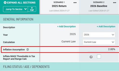 The Inflation Assumption values do not inflate any income entries, so users will not see higher wages, IRA distributions, Social Security, etc., as a result of adjusting the inflation assumption.