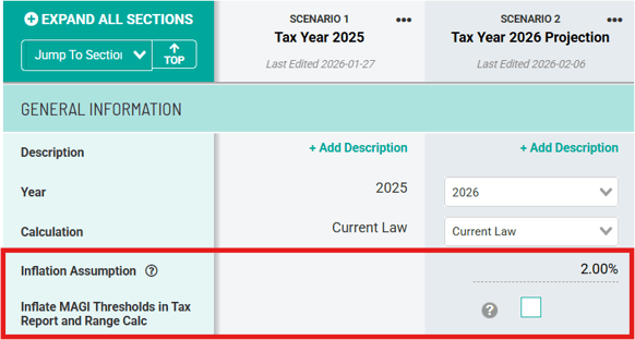 Caution: This checkbox does not impact the tax calculation itself. It will only impact the MAGI bracket and surcharge amounts displayed on the Tax Report, Scenario Analysis, and Range Calc.
