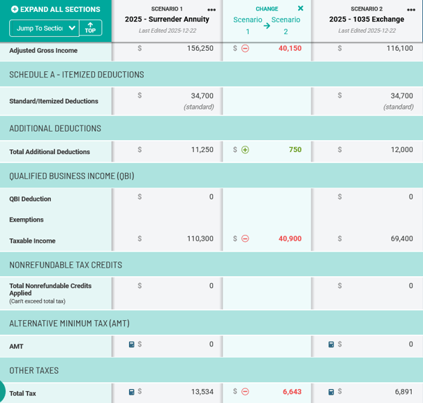 Lastly, use the Scenario Comparison tool to compare the scenarios, focusing on the Total Tax differential between the two: