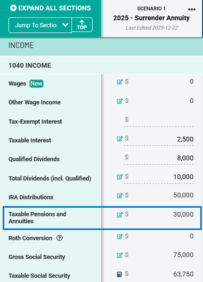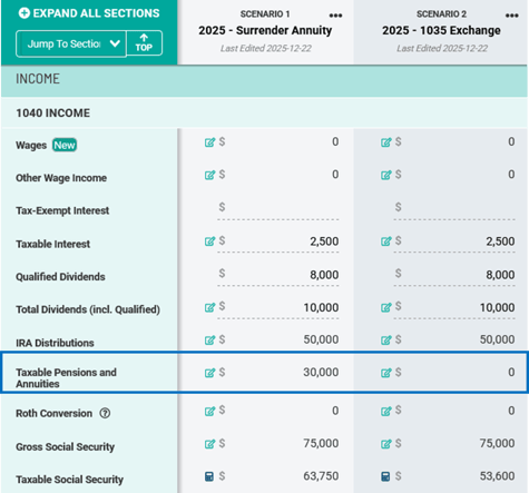 In this example, assume that one of the taxpayers in this Married Filing Joint couple owns a non-qualified variable annuity with $30,000 of gain above basis. If she surrenders the policy, she will realize the $30,000 of gain, with the income showing up in the “Taxable Pensions and Annuities” row: