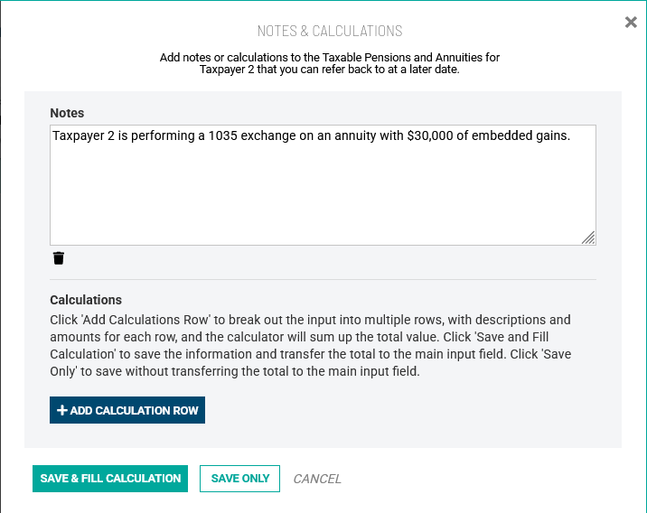 Some users may wish to document the underlying strategy in the Field Notes for the “Taxable Pension and Annuity” field in this copied scenario: