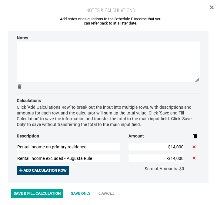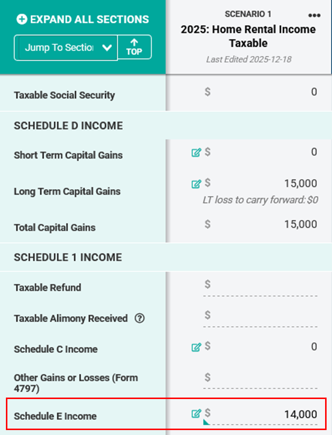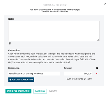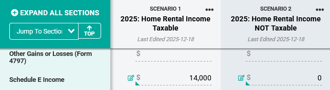 Next, copy this scenario as a new scenario, and either delete the amount of rental income in the Schedule E field or make a corresponding offset in the Field Notes of the new scenario:
