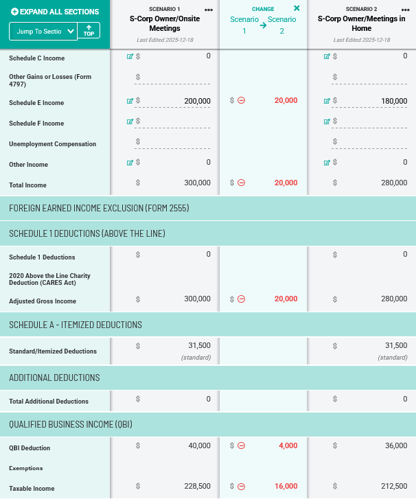 Expanding on this concept, consider a MFJ taxpayer who owns an S-corp that distributes $200,000/year as a profit distribution, with a salary of $100,000. Rather than hold quarterly company meetings onsite, the business owner chooses to hold those meetings at her home. Comparable rental income for the quarterly meetings is $5,000/day, or $20,000 for four meetings over the course of the year.
