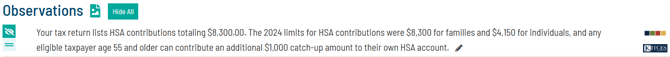 The "Observations" section of the Tax Report will list any non-payroll contributions to a taxpayer's HSA as reported on line 2 of Form 8889.