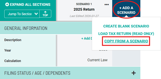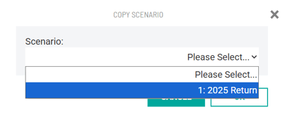When copying from a scenario, select the scenario you want to copy (in this case, Scenario 1: "2025 Return") to create a new, editable Scenario 2 that mirrors the 2025 tax return.