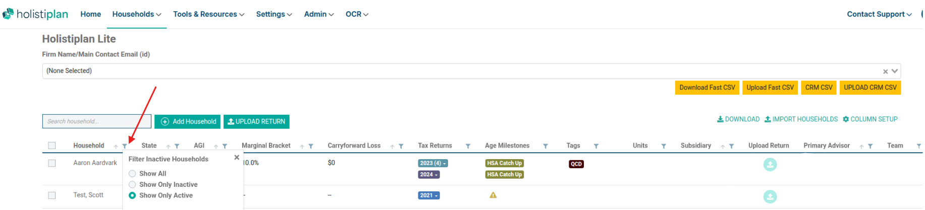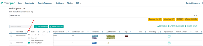By default, your main Household screen will filter to only show Active households. But you can choose to see "Inactive" households and "All Households" by clicking the filter icon in the Household column: