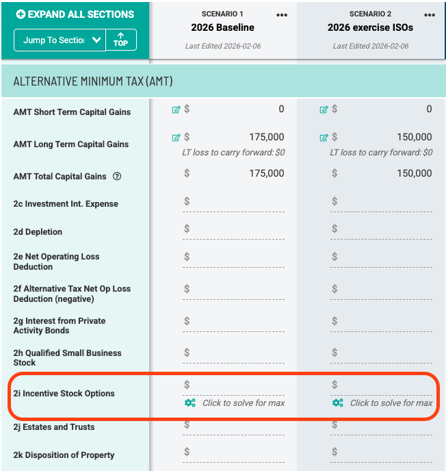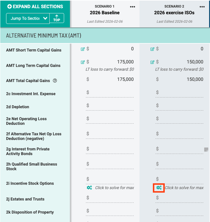 Within Holistiplan, users can determine the dollar amount of ISO bargain element that a client can realize before triggering AMT. Click the "gears" icon underneath the data field in Row 2i, and Holistiplan will calculate that amount.