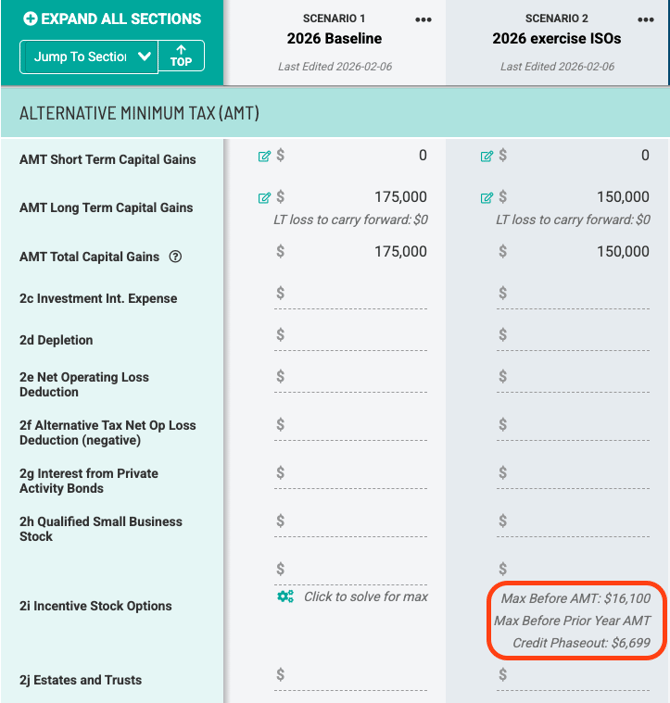 Incentive Stock Options (ISO): "Solve for Max" and "Max Before Prior Year AMT Credit Phaseout"