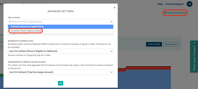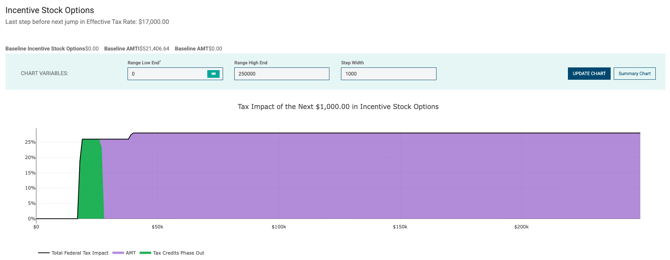 Users can visualize the ISO Solve for Max (for both the credit phase-out and the triggering of AMT) in Range Calc. To do, in Range Calc, click the "Advanced Settings" link shown below, then select "Incentive Stock Options (beta)" as the type of income option. The result will look similar to the example below.
