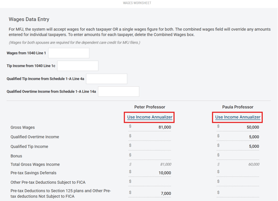- Federal and State Tax Withholdings - Any amounts entered here within the Income Annualizer or Wages Worksheet will flow down into the Federal and State Tax Withholding Calculator sections near the bottom of the Scenario Analysis page.