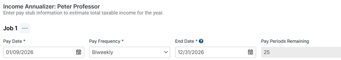 - If the client has multiple jobs, click Add Job in the lower left section of the Income Annualizer window to enter pay information for each job.