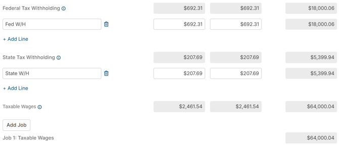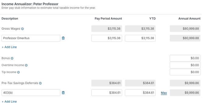 Once the general information for each job (the pay date, pay frequency, and end date) is entered, to enter individual items for the items described below, be sure to click the + Add Line link to add income items. For example, at least one line under Gross Wages must be populated to have any Gross Wages items annualized.